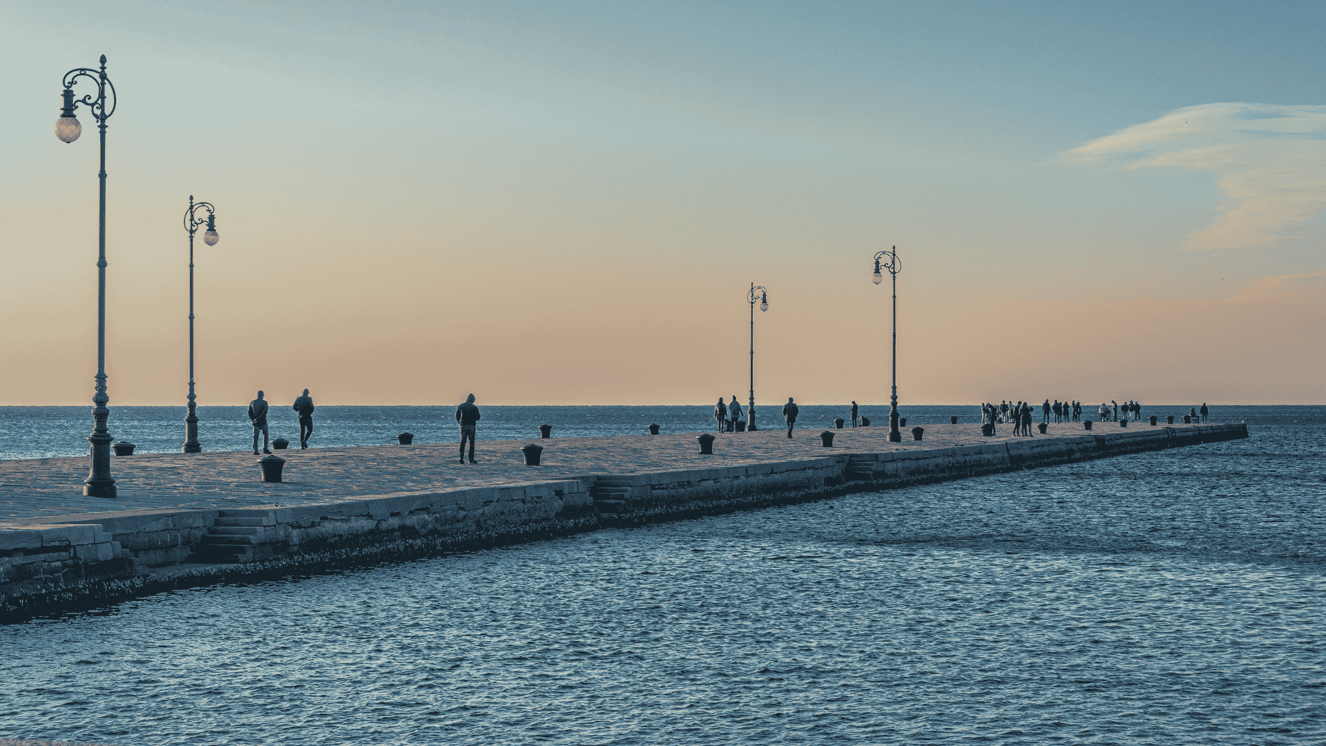 Standing at the edge of the pier, I looked back toward the city. The buildings of the Piazza Unità d’Italia caught the morning light, their facades glowing warmly. I could see the narrow streets winding through the old town, the green shutters of the school I had passed, and even the small coffee shop where I had found my gift.